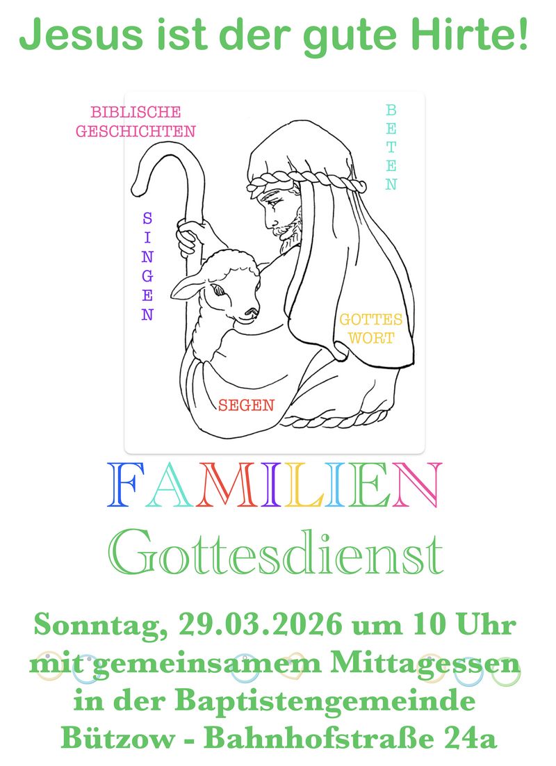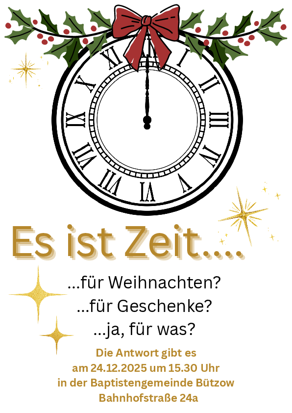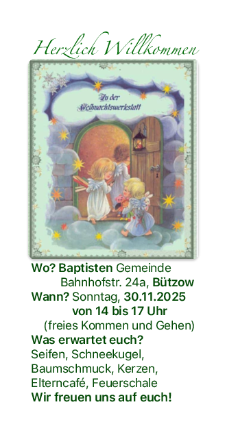 Wir – die Baptisten in Bützow – sind eine kleine Gemeinschaft aus Jung und Alt, die gemeinsam die Verbindung zu Gott, und seinem Sohn Jesus Christus, sucht und lebt.